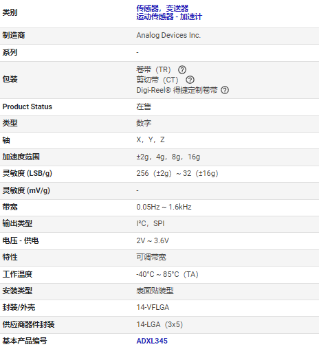 ADXL345BCCZ-RL7 ADI/亚德诺 加速计 X,Y,Z 轴 ±2g,4g,8g,16g 0.05Hz ~ 1.6kHz 14-LGA(3x5)