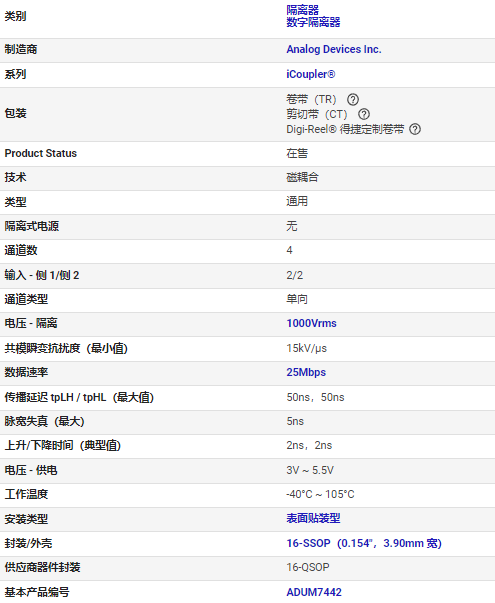 ADUM7442CRQZ-RL7 ADI/亚德诺 通用 数字隔离器 1000Vrms 4 通道 25Mbps 15kV/µs CMTI 16-SSOP(0.1