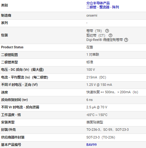 BAV99LT1G ON/安森美 二极管阵列 1 对串联 标准 100 V 215mA(DC)