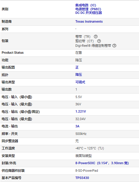 TPS5430DDAR TI 降压 开关稳压器 IC 正 可调式 1.221V 1 输出 3A 8-PowerSOIC(0.154",3.90mm 宽)